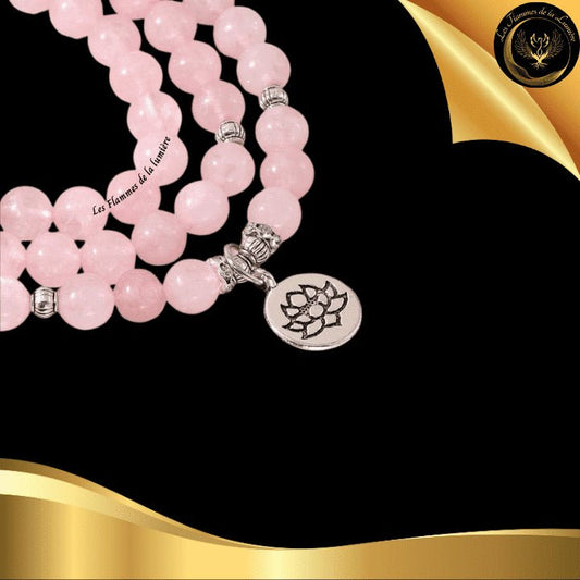 Quartz Rose - Très beau bracelet Mala Tibétain - 108 perles - Lotus - 8 mm